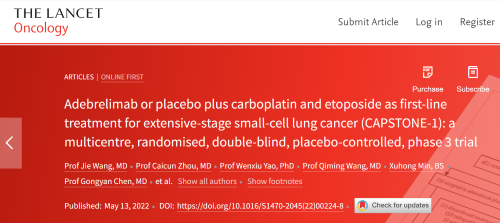 北京时间2022年5月14日,九游会医药自主研发的PD-L1抑制剂阿得贝利单抗治疗广泛期小细胞肺癌的III期临床研究(CAPSTONE-1研究)成果正式全文在线发表于国际权威学术期刊《柳叶刀·肿瘤学》(《THE LANCET Oncology》,影响因子41.316)。CAPSTONE-1研究结果显示,阿得贝利单抗联合化疗一线治疗广泛期小细胞肺癌相较于安慰剂联合化疗可以显著延长患者总生存期至15.3个月[1],刷新现有免疫药物一线治疗广泛期小细胞肺癌的总生存纪录[2]。