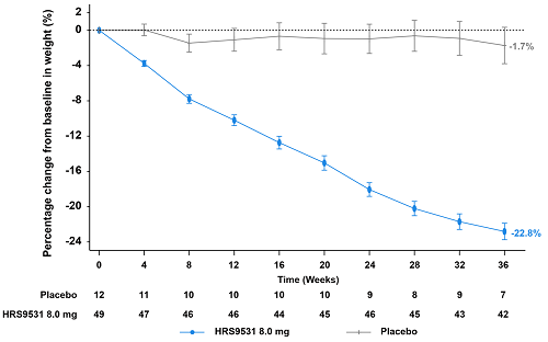 第36周腰围和BMI降低情况:HRS9531注射液8 mg组和安慰剂组的腰围较基线最小二乘均值变化分别为–17.9 cm和–2.5 cm。第36周时,HRS9531注射液8 mg组和安慰剂组的BMI较基线最小二乘均值变化分别为–7.1 kg/m²和–0.7 kg/m²。
