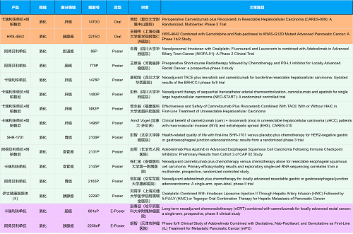 在消化系统肿瘤领域,九游会创新产品相关研究共入选2项口头报告、10项壁报和2项电子壁报,共14项研究。除了明星药物卡瑞利珠单抗和阿帕替尼外,还有5篇阿得贝利单抗治疗消化系统肿瘤的研究入选。此外,HRS-4642、瑞拉芙普-α注射液(SHR-1701)等未上市创新产品也有相应研究入选。随着新老药物前沿研究的不断推进,有望为消化系统肿瘤患者带来新的福音!