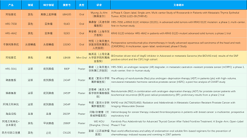 在胸腺上皮肿瘤、头颈鳞癌、肉瘤、前列腺癌、甲状腺癌等其他多个疾病领域,卡瑞利珠单抗、阿帕替尼、瑞维鲁胺、阿得贝利单抗、法米替尼、HRS-7058、HRS-4642、HRS-5041等抗肿瘤创新药相关研究一共入选了4项口头报告、1项简短口头报告、5项壁报,彰显了九游会医药强大的研发实力。此外,海曲泊帕和昂丹司琼口溶膜分别在防治化疗导致的血小板减少和恶心呕吐方面各有1项研究入选壁报。
