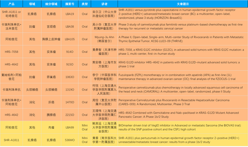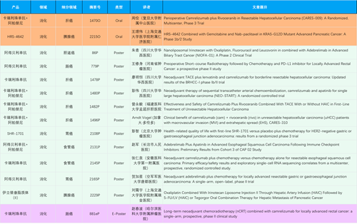 在消化系统肿瘤领域,九游会产品相关研究共入选2项口头报告、11项壁报和1项电子壁报,共14项研究。除卡瑞利珠单抗和阿帕替尼外,还有4篇阿得贝利单抗治疗消化系统肿瘤研究入选。HRS-4642、瑞拉芙普-α注射液(SHR-1701)等在研创新产品也有相应研究亮相。另有1项伊立替康脂质体(II)用于胰腺癌治疗的研究入选壁报。